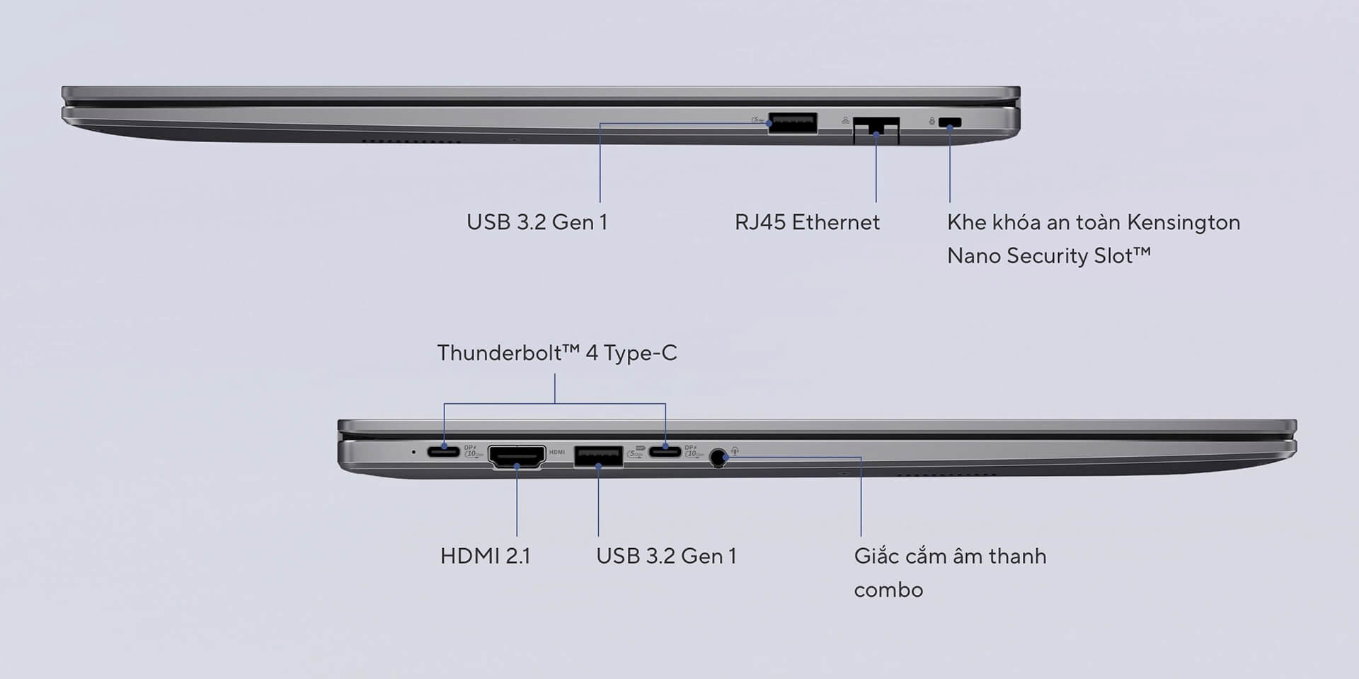 Trong bối cảnh nhu cầu kết nối ngày càng đa dạng, Asus ExpertBook P3 đã bổ sung một bộ sưu tập cổng kết nối toàn diện. Hai cổng Thunderbolt™ 4 Type-C cho phép truyền dữ liệu tốc độ cao, sạc nhanh và xuất hình ảnh đến các thiết bị ngoại vi một cách tối ưu. Ngoài ra, cổng HDMI 2.1 giúp dễ dàng kết nối với màn hình hay projector để thuyết trình hay họp trực tuyến. Chưa kể, cổng RJ45 Ethernet đảm bảo kết nối Internet nhanh, ổn định trong mọi điều kiện.