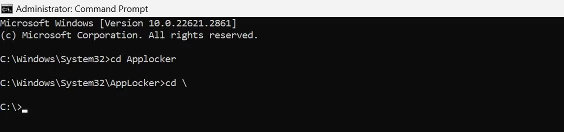 1. Bạn có thể sử dụng lệnh “cd ” để quay lại thư mục root của ổ đĩa hiện tại. Ví dụ, nếu bạn đang ở trong thư mục C:WindowsSystem32AppLocker và muốn quay lại trực tiếp ổ chính C:, hãy nhập lệnh này và nhấn Enter.
