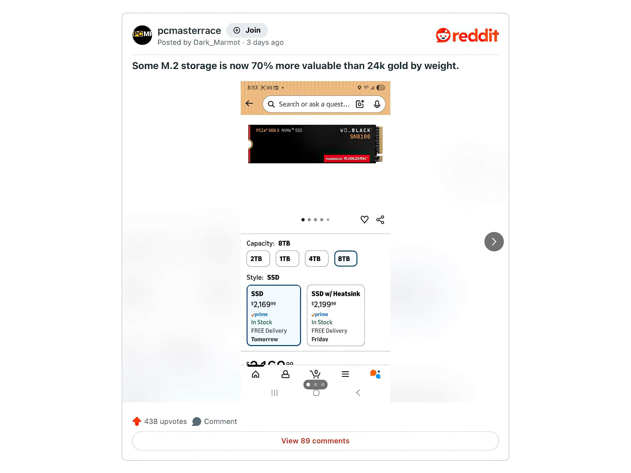 Một thành viên trên diễn đàn công nghệ Reddit có biệt danh là Dark_Marmot gần đây đã đưa ra một tuyên bố gây sốc rằng dòng ổ cứng thể rắn WD Black đắt nhất của Western Digital hiện có giá trị cao hơn 70% so với vàng 24 karat nếu tính theo trọng lượng. Mặc dù mức giá trung bình của các loại SSD trên thị trường vẫn còn thấp hơn nhiều so với “lãnh địa” của vàng, nhưng các tính toán nhanh chóng được thực hiện bởi các chuyên trang công nghệ uy tín như TechSpot và Tom’s Hardware lại cho thấy một bức tranh khác. Theo đó, một số mẫu SSD dung lượng khủng 8TB đã thực sự vượt qua ngưỡng giá trị của vàng, và các mẫu 4TB cũng đang nhanh chóng tiệm cận mức giá này.