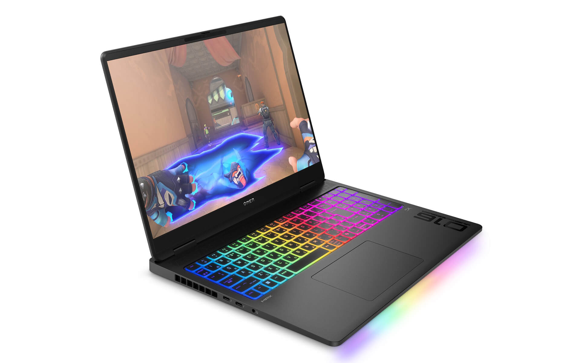 Không thể thiếu trên laptop gaming cao cấp là hệ thống đèn RGB từng phím với khả năng tùy biến linh hoạt. Logo Omen phía sau cũng phát sáng nhịp nhàng, tạo hiệu ứng thị giác ấn tượng. Thiết kế ánh sáng này không chỉ tăng tính thẩm mỹ mà còn giúp game thủ dễ thao tác trong môi trường thiếu sáng, đồng thời thể hiện cá tính độc đáo khi sử dụng ở nơi công cộng hoặc thi đấu chuyên nghiệp.