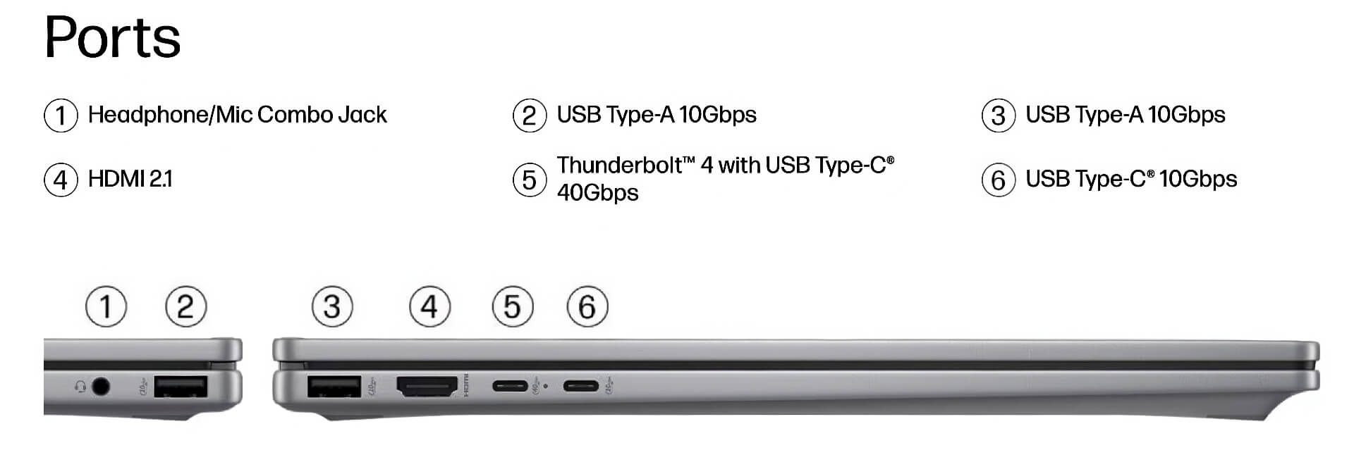 HP OmniBook X Flip Next Gen AI 16 được trang bị hệ thống cổng kết nối hiện đại, đáp ứng trọn vẹn nhu cầu làm việc và giải trí. Máy sở hữu 2 USB Type-A 10Gbps, 1 HDMI 2.1, 1 cổng combo tai nghe/micro, 1 Thunderbolt™ 4 với USB Type-C® 40Gbps hỗ trợ USB Power Delivery 3.1, DisplayPort™ 2.1, HP Sleep and Charge, cùng 1 USB Type-C® 10Gbps tích hợp USB Power Delivery 3.1, DisplayPort™ 1.4a, HP Sleep and Charge. Sự bố trí thông minh này cho phép kết nối linh hoạt với nhiều thiết bị ngoại vi, từ màn hình rời, ổ cứng tốc độ cao cho đến phụ kiện hỗ trợ công việc chuyên nghiệp.