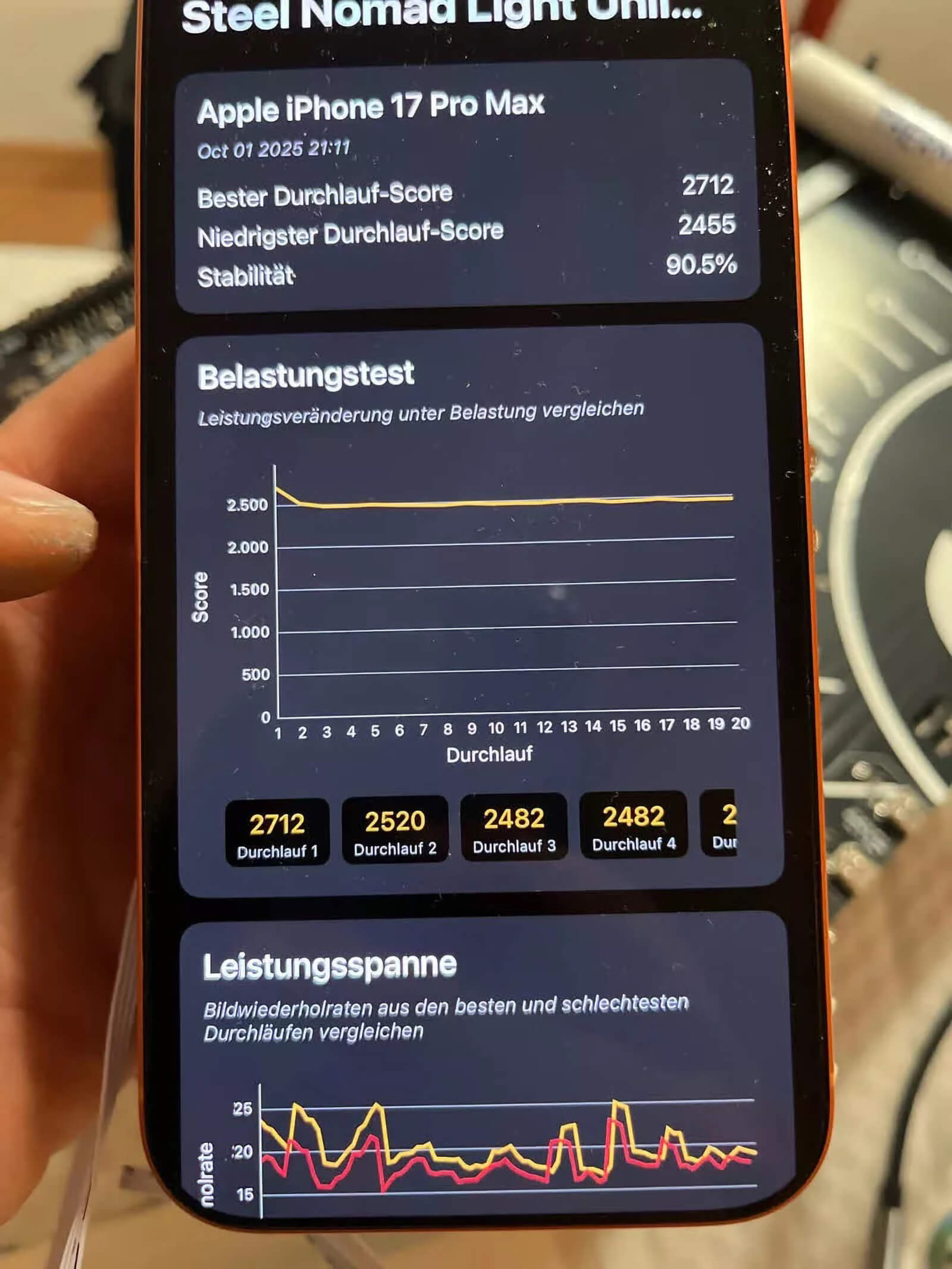 Trong bài test với 3DMark Steel Nomad Light Unlimited, chiếc iPhone gắn tản nhiệt ghi nhận mức ổn định tới 90,5% với điểm số dao động từ 2.455 đến 2.712. So sánh với kết quả của YouTuber Max Tech trên máy nguyên bản, iPhone 17 Pro Max thường đạt điểm từ 1.608 đến 2.318 với độ ổn định khoảng 69,4%. Dù bản tiêu chuẩn vốn đã cải thiện nhiều so với iPhone 16 Pro Max, nhưng sự khác biệt mà bộ tản nhiệt SSD mang lại vẫn rất rõ ràng.
