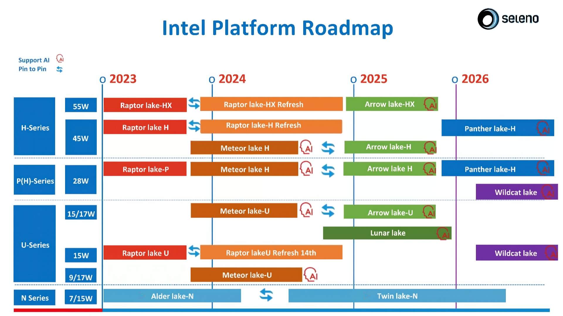 - Các laptop H-series (45–55W) sẽ chuyển từ Raptor Lake Refresh sang Arrow Lake-HX/H, và sau đó là Panther Lake-H.