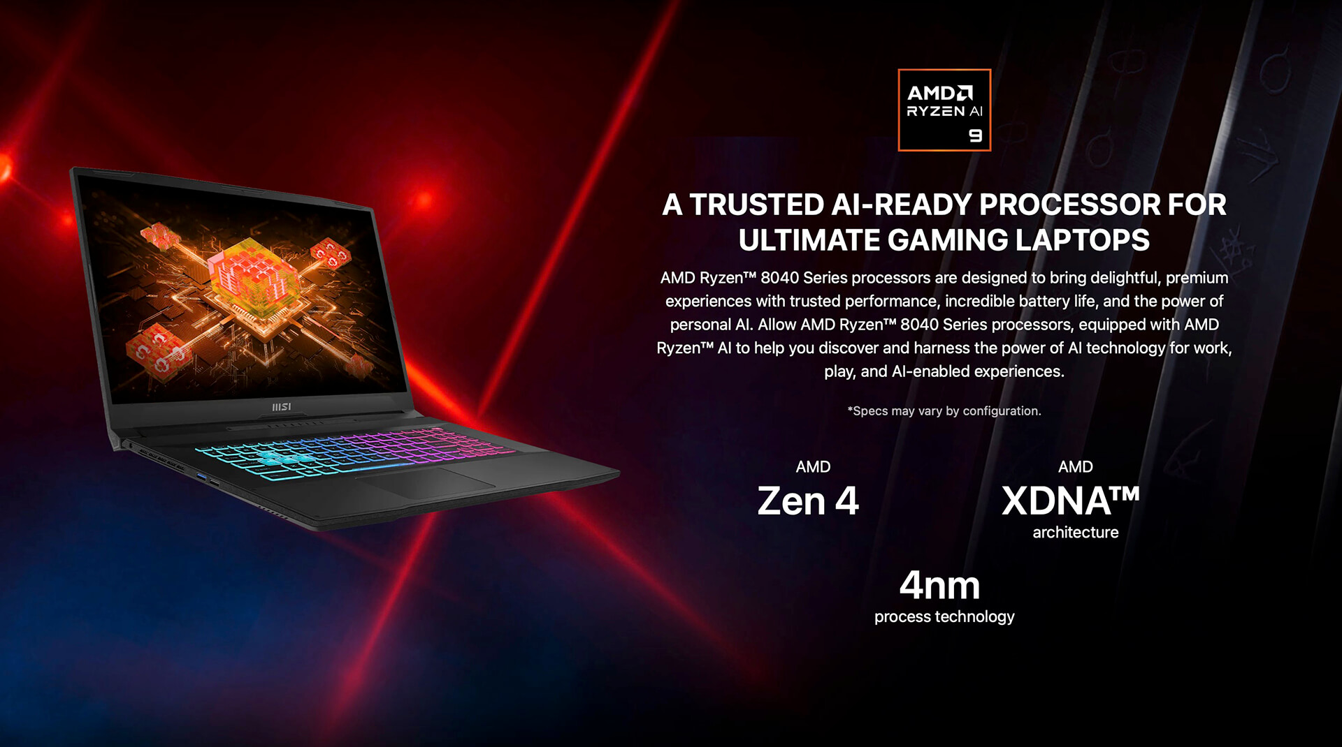 MSI Katana A17 AI (2024) nổi bật với thiết kế hiện đại và loạt công nghệ tiên tiến, mang đến một trải nghiệm toàn diện cho người dùng yêu cầu hiệu suất cao. Nhờ tích hợp vi xử lý AMD Ryzen™ 9 thế hệ mới và card đồ họa RTX™ 40 Series, chiếc laptop này không chỉ đáp ứng tốt nhu cầu làm việc chuyên sâu mà còn là lựa chọn lý tưởng cho các game thủ với khả năng xử lý mượt mà những tựa game nặng.