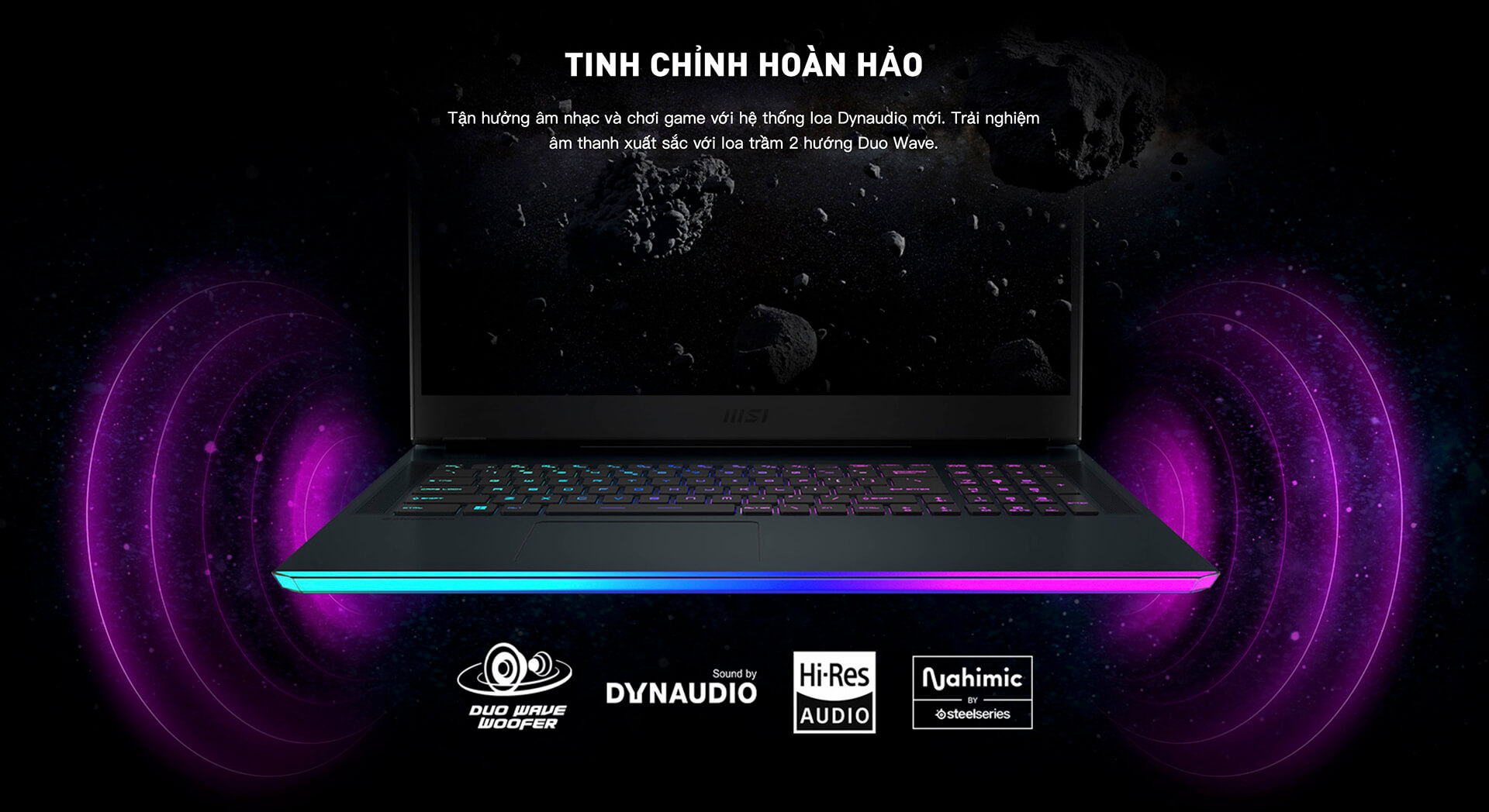 MSI Raider GE76 12UE được trang bị hệ thống loa âm thanh cao cấp, mang đến trải nghiệm âm thanh sống động và chân thực. Âm thanh vòm 3D cùng công nghệ Sound Blaster Cinema 6 giúp cho người dùng được đắm chìm trong không gian âm nhạc và game một cách hoàn hảo.
