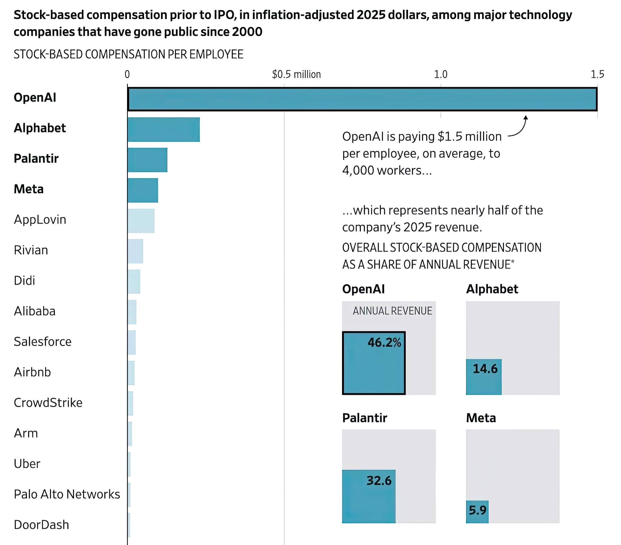 Đến năm 2025, chi phí lương thưởng của OpenAI được dự báo sẽ chiếm tới 46% tổng doanh thu. Đây là một tỷ lệ cao hơn bất kỳ công ty công nghệ lớn nào trước khi lên sàn chứng khoán, ngoại trừ nhà sản xuất xe điện Rivian, đơn vị đã báo cáo không có doanh thu trong năm trước khi IPO. Để so sánh, chi phí trả thưởng bằng cổ phiếu của Palantir chỉ bằng 33% doanh thu vào năm 2020, của Google đứng ở mức 15% trước khi IPO, và của Facebook chỉ là vỏn vẹn 6%, theo phân tích của Equilar. Tính trung bình, các công ty công nghệ giai đoạn tiền IPO thường chỉ dành khoảng 6% doanh thu cho việc chi trả bằng cổ phiếu, cho thấy mức độ chịu chơi chưa từng có của OpenAI trong bối cảnh hiện tại.