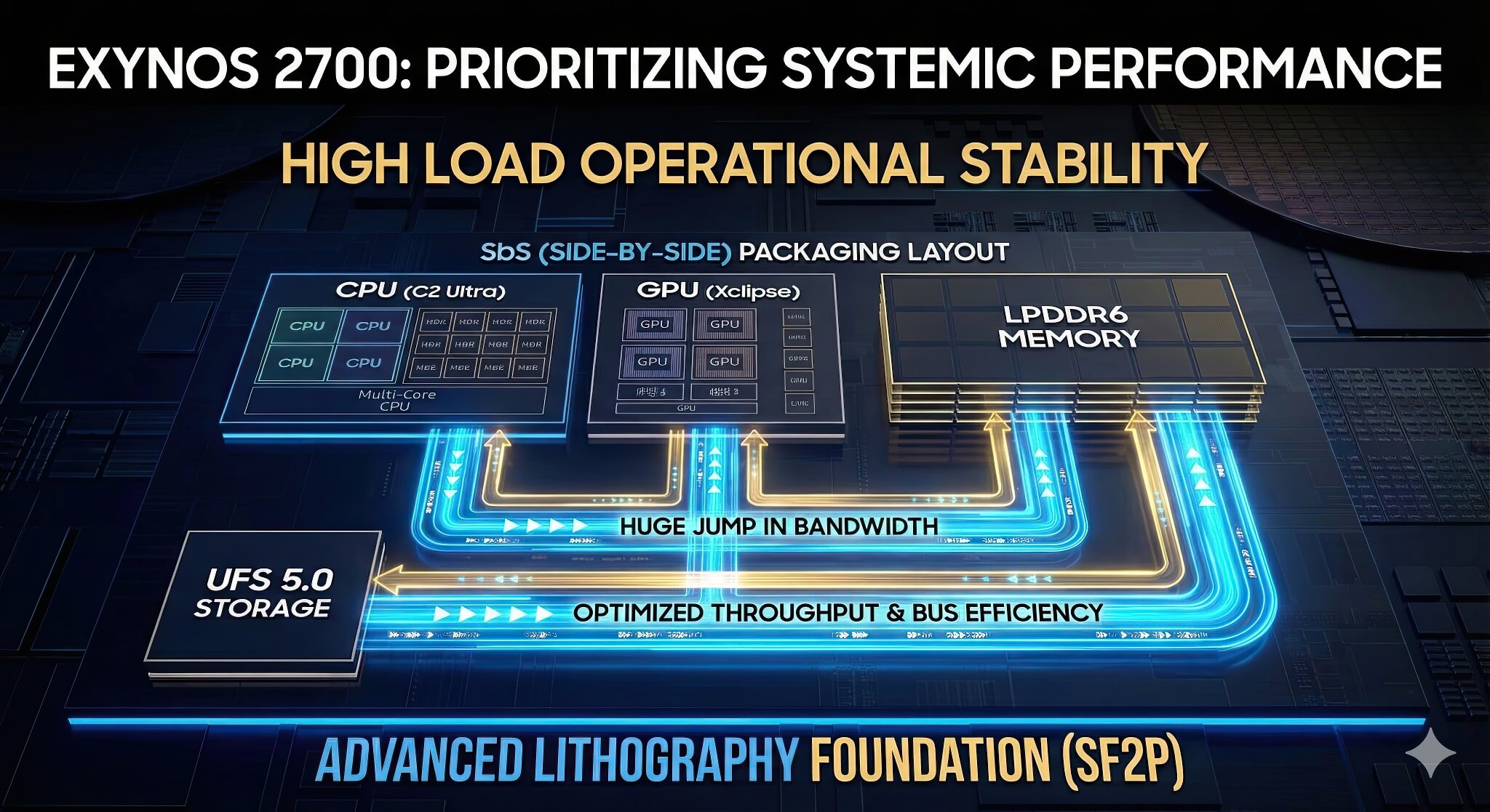 Điểm thay đổi mang tính cách mạng nhất trong thiết kế của Exynos 2700 có lẽ nằm ở công nghệ đóng gói. Chipset này được cho là sẽ sử dụng công nghệ đóng gói FOWLP-SbS (Side-by-Side), tận dụng một Khối Đường dẫn Nhiệt (Heat Path Block – HPB) thống nhất bằng đồng cho cả DRAM và bộ vi xử lý (AP). Sự thay đổi này cho phép quá trình tản nhiệt diễn ra hiệu quả hơn rất nhiều. Khác với cách triển khai hiện tại trên Exynos 2600 khi chỉ một phần của AP tiếp xúc trực tiếp với tản nhiệt, công nghệ mới trên Exynos 2700 sẽ cho phép khối tản nhiệt HPB bao phủ toàn bộ bề mặt của bộ vi xử lý, đảm bảo sự ổn định tối đa khi hoạt động ở cường độ cao.